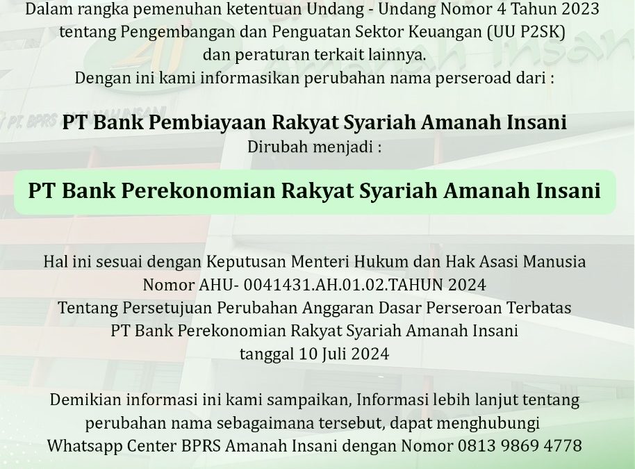berubah nama dari PT Bank Pembiayaan Rakyat Syariah Amanah Insani menjadi